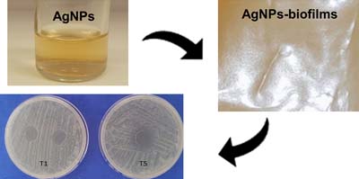 Cellulose-based composite biofilms doped with silver nanoparticles (AgNPs) have been produced by eco-friendly process. The AgNPs were synthesized from Ilex paraguariensis. The biofilms showed activity against the bacterium Pseudomonus fluorescens.