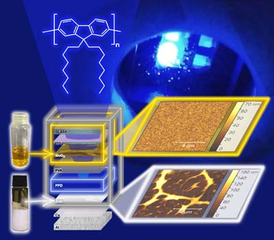 Solution-processed metal oxides based on low-cost materials and synthesized by facile routes were used applied as charge transport materials in blue light-emitting diodes containing the polymer poly(9,9-dioctyl-9H-fluorene-2,7-diyl) as emissive layer. The morphological properties of the oxides were tuned and used to boost the diode performance, leading to an enhancement of almost one order of magnitude in the luminance. Details are presented in the Article Metal Oxide Films as Charge Transport Layers for Solution-Processed Polymer Light-Emitting Diodes by Andreia de Morais and Jilian N. de Freitas on page 377.