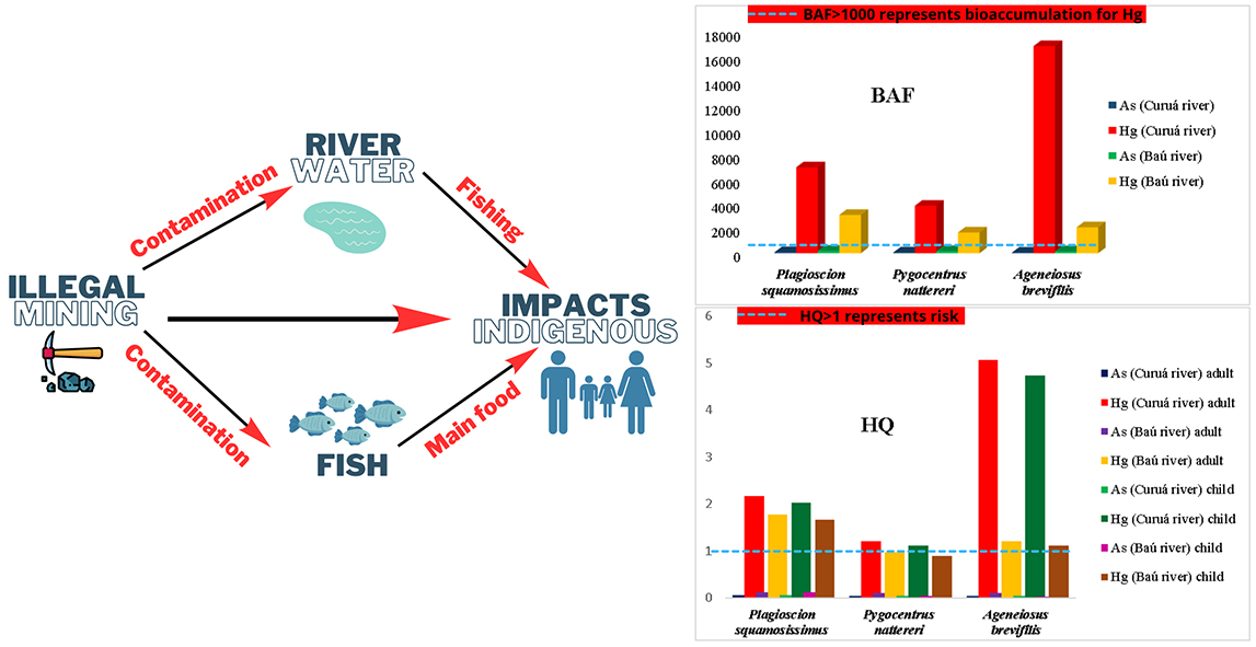 Risk assessment (hazard quotient (HQ)) for children and adults and bioaccumulation factor (BAF) in fish in an area impacted by mining activity.