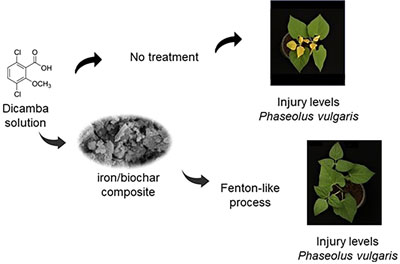 An iron/biochar composite was produced from pyrolysis of coffee husks. This one was used as a catalyst of dicamba degradation by heterogeneous Fenton-like process.
