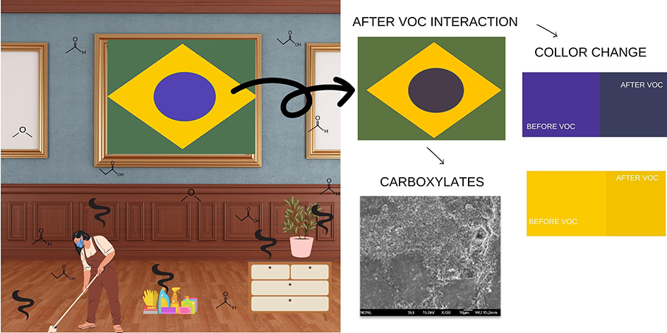 If the Brazilian flag were painted with the green, yellow and blue pigments shown (chromium oxide, cadmium yellow and ultramarine blue, respectively), exposure to volatile organic compounds (VOC) would cause the colors to shift accordingly.