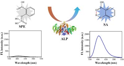 Sensitive and fluorimetric alkaline phosphatase (ALP) detection using monoaromatic probe via regulating intramolecular hydrogen bonding is proposed.