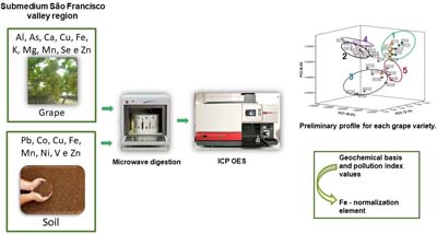 The study evaluated the distribution of multi-element in grape must samples and in soil employing inductively coupled plasma optical emission spectrometry (ICP OES), to establish a profile of the different types of grapes and estimated contamination levels of the grape growing area through background values.