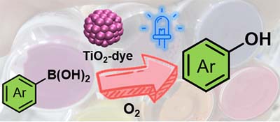 We report the preparation of a number of nanohybrids based on dye-sensitized TiO2 composites. Their application as heterogeneous photocatalyst for the oxidative hydroxylation of boronic acids and esters to synthesize phenols was investigated.