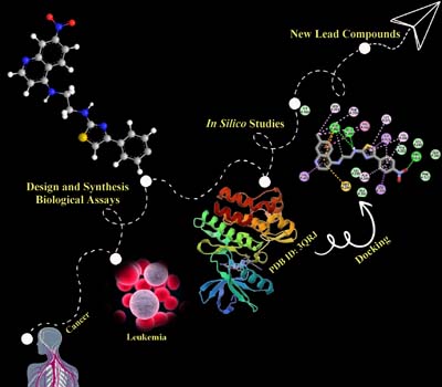 The artwork summarizes the drug discovery pathway, tracing the journey from the initial motivation to find a cure for a specific disease to the intricate development of novel lead compounds. It visually delineates the key steps, emphasizing the structure of a reported quinoline-thiazole hybrid and showcasing the in silico studies conducted in this research. Details are presented in the Article Design, Synthesis, and Molecular Docking Studies of New Quinoline‑Thiazole Hybrids, Potential Leads in the Development of Novel Antileukemic Agents by Victor Facchinetti, Claudia Regina B. Gomes, Karoline C. L. Aboud, Rodolfo G. Fiorot, Guilherme G. C. de Carvalho, Carlos Roberto K. Paier, Claudia do Ó Pessoa, Anne Caroline C. Gomes, Marcus Vinícius N. de Souza and Thatyana R. A. Vasconcelos on e-20230139.