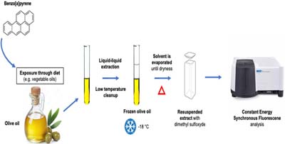 Schematic representation of the incidence of benzo[a]pyrene in olive oil and the employed method to determine its presence and concentration.