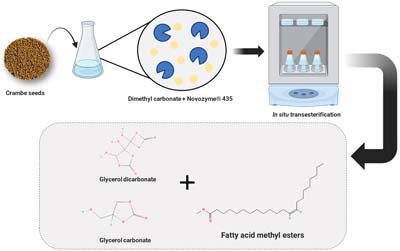 In situ production of methyl esters from crambe seeds applying dimethyl carbonate, as extraction solvent and acyl acceptor, and enzymatic catalyst.