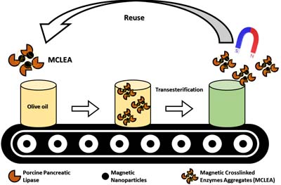 Magnetic crosslinked enzyme aggregates finding application on olive oil transesterification. It may be magnetically separated and reused for 6 cycles.
