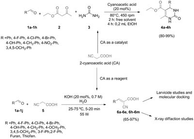 An efficient and green methodology for the use of cyanoacetic acid as active methylene group to aldol type condensation reaction and catalyst for Biginelli reaction was investigated in this study.
