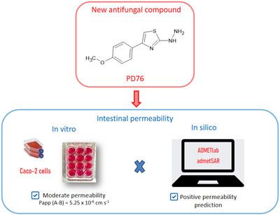 2-Hydrazinyl-4-(4-methoxyphenyl)thiazole (PD76) intestinal permeability was assessed by means of the comparison of in vitro assay in Caco-2 cells and in silico platforms.
