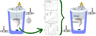 The image presents a vortex-operated plasma reactor, UV-spectra and chemical kinetics data, culminating in the determinant step for HNO3(aq) production.