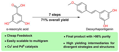 A seven-step high yielding process from low cost α-resorcylic acid to obtain deoxyrhapontigenin is presented. Intermediaries for divergent strategies and structures are also obtained in high yields.