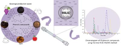 This study proposes a method for the simultaneous determination of 31 phenolic compounds by hydrophilic interaction chromatography coupled with triple quadrupole mass spectrometry (HILIC-MS/MS) and its application in residues from the beverage industry.