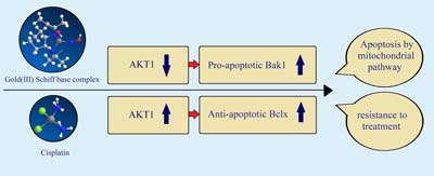 The gold(III) Schiff base complex reduces the expression of the AKT1 gene, leading to an increase in the expression of the apoptosis-promoting gene Bak1. In contrast, cisplatin increases the expression of the AKT1 gene, followed by an increase in the anti-apoptotic Bclx gene, resulting in treatment resistance.
