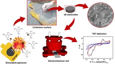 We present a collector-detector device for the electrochemical analysis of explosives in post-explosion residues fabricated by a desktop 3D printer and a conductive filament made of recycled polylactic acid (PLA), carbon black and graphite.