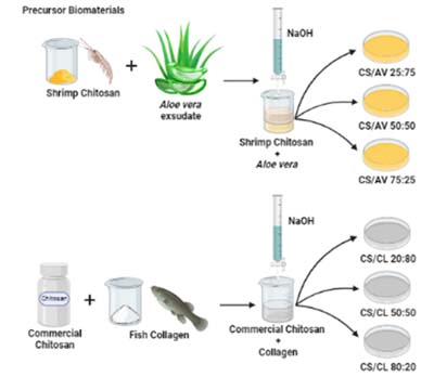 This work consists of proposing simple and selective routes for chitosan-based blends with fish collagen and Aloe vera exudate.