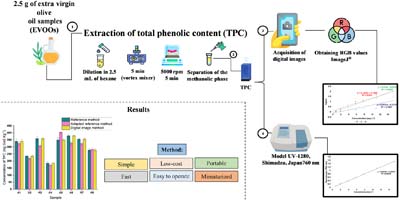 This study developed a simple, fast and low-cost method for the quantification of total phenolic content (TPC) in extra virgin olive oil samples (EVOOs), using an optimized colorimetric reaction with the Folin-Ciocalteu reagent and the acquisition of digital images with a smartphone.