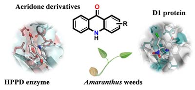 This study presents the synthesis of acridone derivatives and their evaluation as photosystem II inhibitors and herbicides. Among the tested compounds, acridin-9(10H)-one demonstrated the best photosystem II (PSII) inhibition, while 2-chloroacridin-9(10H)-one and 9(10H)-acridone-4-carboxylic acid exhibited herbicidal activity against Amaranthus species. Molecular docking analysis indicated that carbonyl groups and aromatic substituents are essential for ligand interactions, providing insights for designing new bioactive scaffolds.