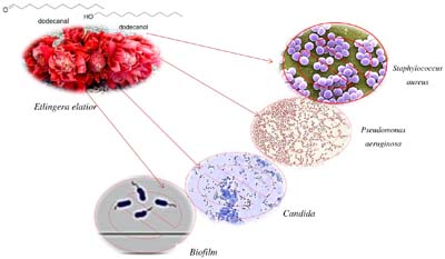 Antimicrobial and antibiofilm activities of the essential oil from the inflorescence of Etlingera elatior (Zingiberaceae) and its main constituents (dodecanal and 1-dodecanol).