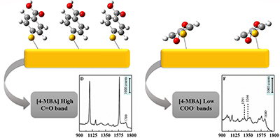 When 4-mercaptobenzoic acid (4-MBA) concentration decreases, the molecules reorient, leading to interaction of the carboxylate group with the gold nanoparticles (AuNP) surface, besides the thiolate interaction, as probed by surface-enhanced Raman scattering (SERS).
