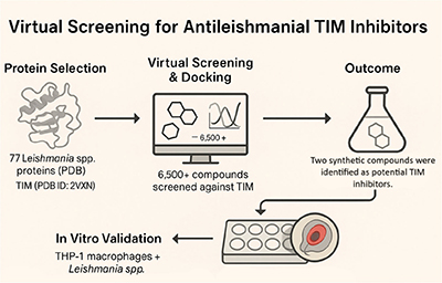 The graphical abstract illustrates the workflow of a virtual screening study targeting Leishmania triosephosphate isomerase (TIM), highlighting protein selection, compound docking, molecular dynamics and in vitro validation.