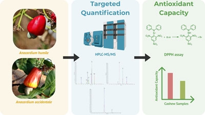 The figure illustrates the targeted quantification of bioactive compounds from Anacardium humile and Anacardium occidentale using high-performance liquid chromatography mass spectrometry (HPLC-MS/MS), followed by an evaluation of their antioxidant capacity via the 2,2-diphenyl-1-picrylhydrazyl (DPPH) assay.