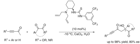 The chiral thiourea catalyzed direct aldol reaction of unmodified methyl ynones under aqueous conditions is described. This procedure afforded β-hydroxyynones bearing a quaternary carbon center with moderate to good yields and enantioselectivities