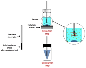 Polythiophene films were electropolymerized on the surface of metal (stainless steel) wires for the development of solid-phase microextraction (SPME). These polymeric films were evaluated as SPME phases for the liquid chromatography (LC) analysis of antidepressants in plasma samples for toxicological analysis purpose