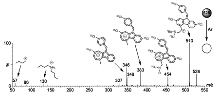 ESI(+)-MS/MS spectra of protonated lumefantrine (m/z 528), showing rich dissociation chemistry. Water loss is the most favored initial dissociation forming the major fragment ion of m/z 510. This elimination is likely favored due to the formation of a highly stable, fully delocalized, resonance stabilized benzyl-like cation, which may rearranges to a tropylium-like ion