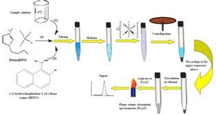 Schematic diagram for preconcentration and determination of zinc by in situ solvent formation microextraction based on use of ionic liquid (IL)) as an extractant solvent, sodium hexafluoro-phosphate (NaPF6) as an ion-pairing agent, 1-(2-hydroxynaphtalene-1-yl) ethane oxime as complexing agent and detection by flame atomic absorption spectrometry