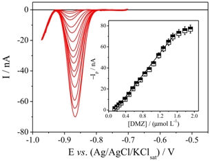 Square-wave voltammograms and the corresponding analytical curve for various concentrations of DMZ in raw natural waters on the HMDE under optimum conditions