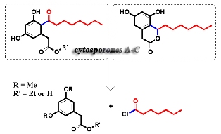 The preparation of cytosporones A-C from the same starting material through a short synthetic route, with good yields, is reported. All compounds were tested for allelopathic activity on lettuce seeds. Cytosporone A and its methylated precursor showed remarkable allelopathic activity, inhibiting seed germination and seedling growth