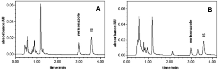 A new and extensively validated ultra-performance liquid chromatographic method for voriconazole measurement in plasma and oral fluid is presented. Run time was 4 min, with mobile phase comsuption of 2.2 mL per analysis. Panel A shows a chromatogram of a plasma sample and panel B shows the chromatogram of an oral fluid sample, both from the same patient
