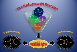 A series of metal halide hydrates was proved to be efficient Lewis acid catalysts promoting the multicomponent Radziszewski reaction for the triarylimidazole synthesis in alcoholic media. In absence of aldehyde, triaryloxazoles were obtained in good yields