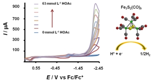Fe3S2(CO)9 catalyzes the electrochemical reduction of acetic acid to produce H2; it mimics the [Fe-Fe] hydrogenase enzyme