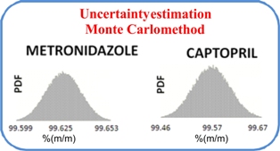 Uncertainty estimation is essential to ensure metrological traceability of measurement results to the International System of Units (SI). The application of the Monte Carlo method, an alternative approach to the traditional method (GUM), is demonstrated for uncertainty estimation of captopril and metronidazole mass fractions in two new certified reference materials (CRM)
