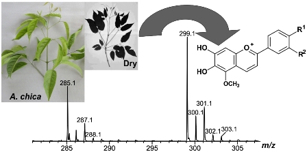 Arrabidaea chica (crajiru) is an important Amazonian plant that is used as antimicrobial agent. Direct infusion was used to differentiate three distinct varieties via electrospray ionization mass spectrometry (ESI(+)-MS) fingerprinting. 3-Deoxyanthocyanidin cations were used as markers in the PLS-DA (partial least squares-discriminant analysis) data treatment