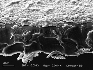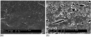 The figure shows the micrographs of the thermoplastic starch film with 30% of PLA (M3030), not treated (a) and treated (b) with chloroform, where the phase domains can be observed