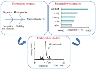 Certified reference materials (CRM) can ensure metrological traceability of measurement results to the international system of units (SI). The certification procedure includes material characterization, homogeneity and stability studies, and uncertainties estimation, as exemplified for the metronidazole CRM, second Brazilian CRM of an active pharmaceutical ingredient (API)