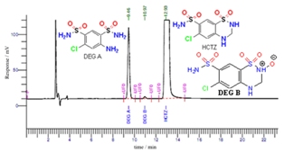 Selective LC-MS compatible stability indicating method was developed and validated. Degradants were characterized by LC-MS/MS. Fragmentation pattern and mechanism of degradation was established for hydrochlorothiazide