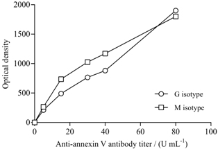 Validation of a simple and sensitive method for quantification of autoantibodies to annexin V in plasma with high reproducibility and reliability. Calibration curves for IgG and IgM isotypes were obtained by plotting optical density vs. concentration of the calibrators used (5, 15, 30, 40 and 80 U mL-1) in a semilogarithmic scale