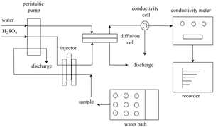 The Klebsiella oxytoca bacterium was used as a test organism in toxicity evaluations of metals (Hg2+, Cd2+ and Cu2+) and detergents (Laborhex 2 and Riodeine Degermant). The inhibition of bacterial growth was quantified by flow injection analysis (FIA) via conductometric measurements of the CO2 produced during respiration
