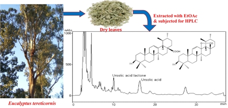 A validated RP-HPLC method developed for the simultaneous quantification of ursolic acid (UA) and ursolic acid lactone (UAL) in the leaf extract of E. tereticornis with excellent precision, accuracy, linearity. This method can be routinely used for the analysis of UA and UAL in the extracts and formulations containing E. tereticornis leaves
