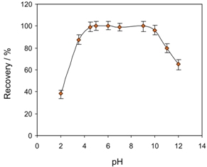 The effect of pH upon the retention of mesalamine (5-aminosalicylic acid) on the Ni-Al (NO3-) layered double hydroxide as a nanosorbent in solid-phase extraction system is shown. The highest extraction efficiency was achieved between pH 4 and 9