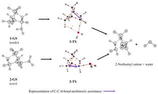 Representation of critical points of the PES of the first step of the nucleophilically unassisted solvolysis of protonated 2-endo- and 2-exo-norbornanol as optimized geometries (1-GS, 2-GS, 2-norbornyl cation and water) and molecular graphs (1-TS and 2-TS)