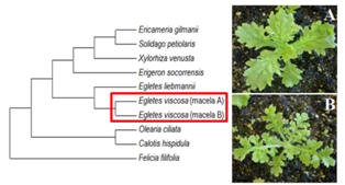 There are two chemotypes of "macela" (Egletes viscosa (L.) Less.), whose essential oils are characterized by the presence of trans-pinocarveyl acetate (chemotype A) or cis-isopinocarveyl acetate (chemotype B). Analysis of ITS/5.8S DNA sequences provides an effective and accurate strategy for identifying the chemotypes from E. viscosa
