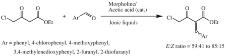 Knoevenagel condensations of aromatic aldehydes with ethyl 4-chloro-3-oxobutanoate were carried out in ionic liquids to give ethyl (E)/(Z)-2-chloroacetyl-3-arylpropenoates. The ionic liquid [bmim(NTf2)] was reused up to 4 times without loss in product yields, and an unequivocal methodology of (E)/(Z)-structural analysis by 13C NMR (nuclear magnetic resonance) is presented
