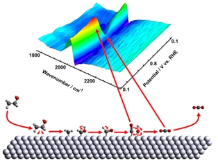 ATR-SEIRAS experiments performed on Pt and PtRu electrodeposits show that CO is formed at low potentials (~ 0.1 V) on both surfaces and remains adsorbed, blocking surface sites and thus inhibiting ethanol oxidation. Kinetic modeling suggests that CO adsorbed layer is not influenced by the presence of Ru, whilst its oxidation is clearly favored in the presence of this metal