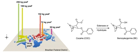 The consumption of cocaine in the Brazilian Federal District, via sewage analysis, was estimated in 1.0 ton year-1. Sampling at different wastewater treatment plants allowed the detection of areas with higher consumption
