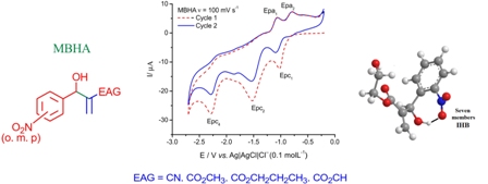 This work presents electrochemical studies, in aprotic media, of twelve Morita-Baylis-Hillman adducts (MBHA) with significant leishmanicidal activity, together with conformational calculations. Ortho adducts present facilitated reduction in comparison to the other isomers and higher leishmanicidal activity. Molecular hardness (N) and atomic charges (QN) values corroborate the obtained experimental data